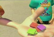Jimmy then got out a green and blue cube, opened it, and poured its contents