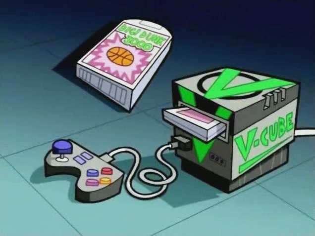 The V-Cube was a video game console in the Fairly OddParents episode 'Odd Ball'. It was a parody of the Nintendo GameCube and the Microsoft XBOX.